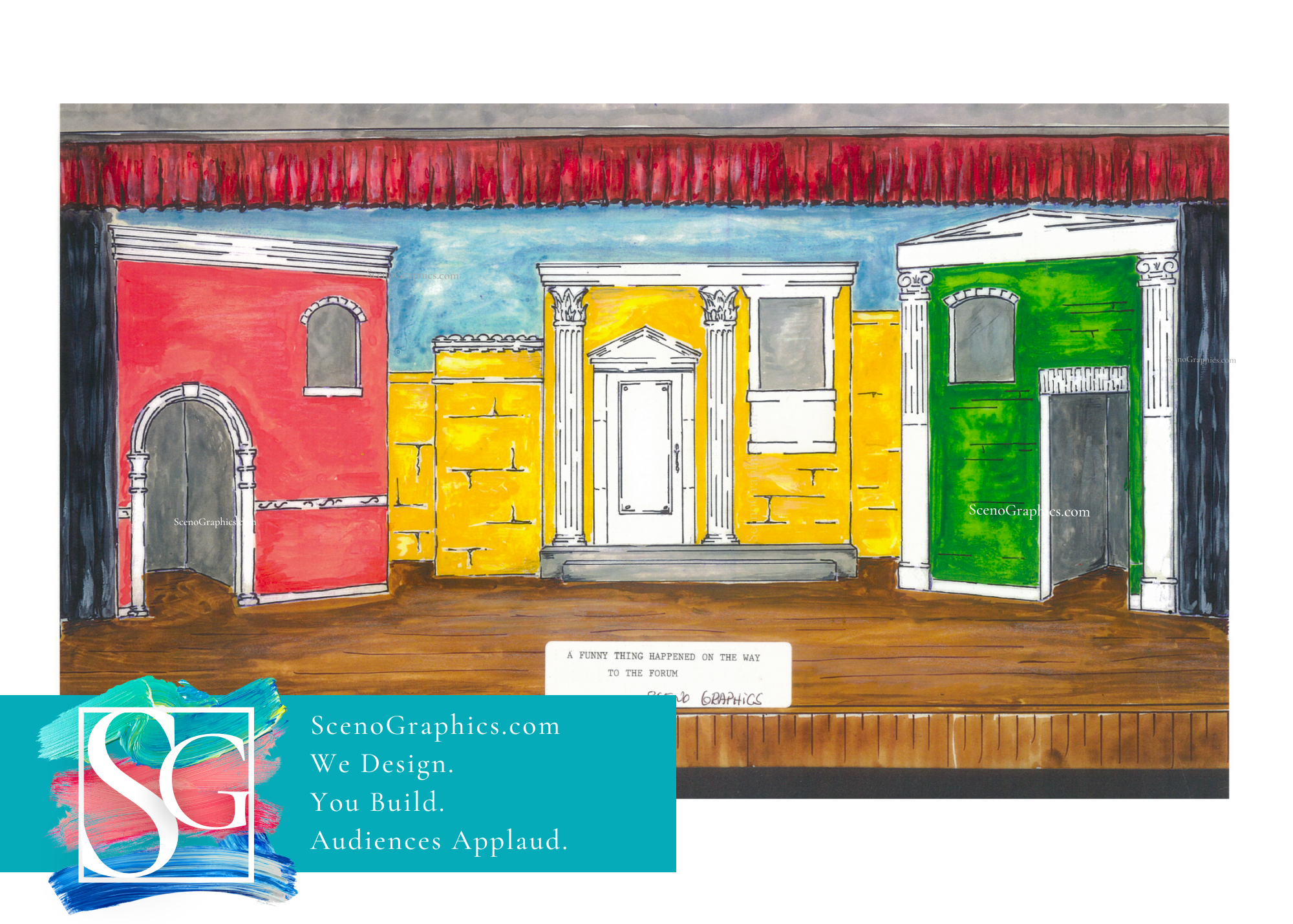 The "A Funny Thing Happened on the Way to the Forum" Design Pak contains detailed blueprints and instructions to build three fancy houses with a village ground row. Seen in images 1-2.