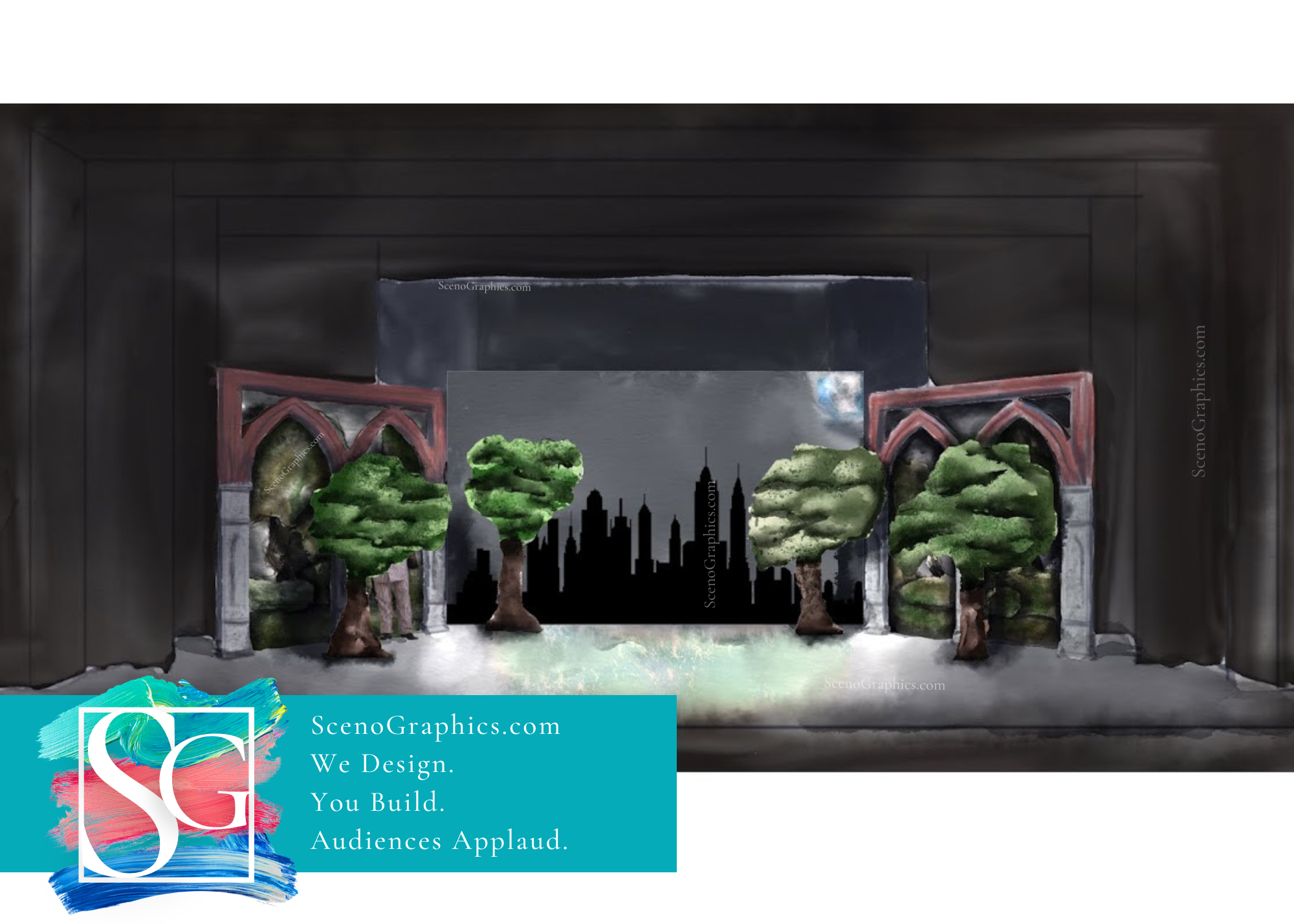 Our design for "The Addams Family" has permanent standing units upstage, stage left, and stage right. Two curtains behind the arches slide to change the locations while other pieces come on and off the stage. This is a compact design.