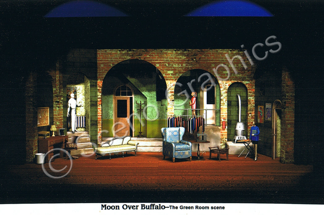For our "Moon Over Buffalo" sets, the Green Room is designed with interesting arches, steps, and levels. “Private Lives” plays in front of the main street using arches and a Romanesque balcony. “Cyrano” uses easy-to-find props.